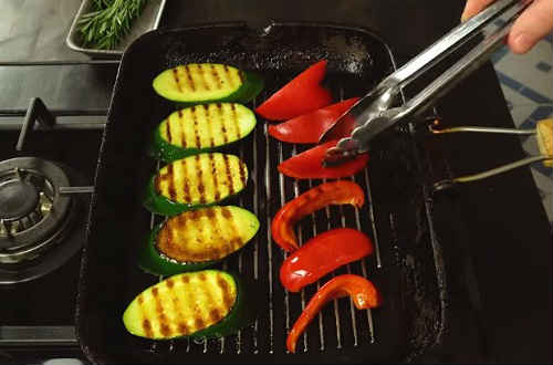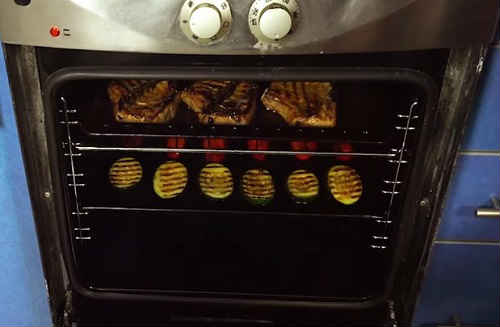 Помістіть на верхній рівень. Через 5 хвилин від початку запікання, поставте на середню грати сковороду з овочами.