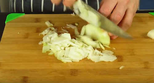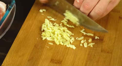 Роздушіть ножем зубчики часнику, потім дрібно порубаєте їх.