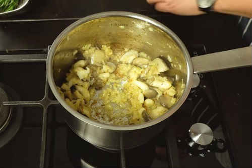 На дно сотейника налийте масло. Обсмажте спочатку цибулю, потім додайте гливи і обсмажте компоненти разом.