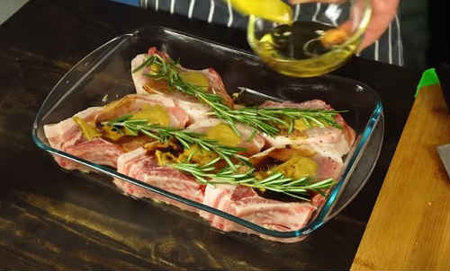 Руками розмажте приправи по м’ясу. Затягніть форму плівкою, залишити на столі на кілька годин (якщо дуже хочеться їсти, скоротіть час маринування на півгодини).