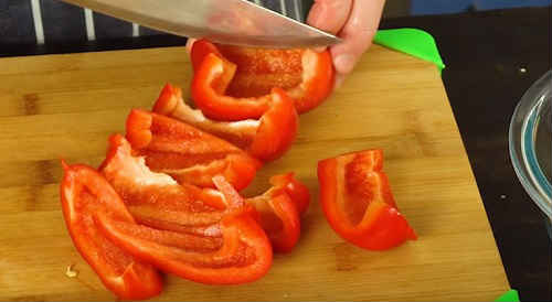 У болгарських перців вирізати насінну коробку, м’якоть поділіть шматочками.