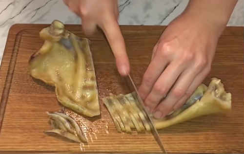 Увага! Якщо зварені вуха порося остудити, придавивши пресом, зручніше буде нарізати їх соломкою.