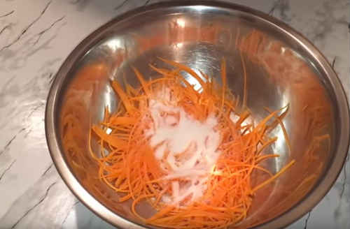 На корейській тертці натріть моркву. Засипте цукор, посоліть. Перетріть руками.
