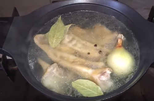 Надішліть варитися на сильний вогонь. Коли бульйон закипить, закладіть цілком цибулину, лавровий лист, горошини перцю. Зменшіть потужність вогню до середнього. Варіть півтори години при слабкому кипінні. Наприкінці варіння вушка стануть м’якими, але відходити від кісточок не повинні.