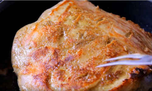 Якщо хочете запечатати м’ясний сік і зробити окіст соковитіше, обсмажте цілий шматок у великій кількості олії на сковороді. Вогонь робіть максимально сильним. Ця процедура необов’язкова, але я раджу.