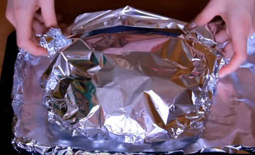 - Викладіть м’ясо, залишилася оберніть фольгою, щоб не залишилося дірочок, гарненько закріпіть.