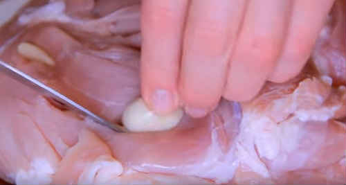 У шаховому порядку зробіть проколи по всьому шматку і нашпигуйте м’ясо часником. Часточки вкладайте глибше.