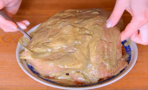 Свинина запікається цілим шматком, завдяки цьому зберігає соковитість м’яса. Маринад з гірчицею вже став звичним, і багато оцінили його приємну смакову нотку.