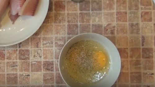 - Рибне філе поділіть на половинки. Умочіть заготовки в яйце, після перенесіть у підготовлену панірування.