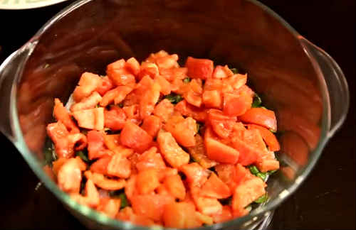 З помідорів бажано зняти шкірку, а потім порізати кубиками. Видалити шкірку не обов’язково, тут вирішуйте самі. Багато видаляють з томатів насінну частину, але вважаю це зайвим, тілапія не буде досить соковитою.