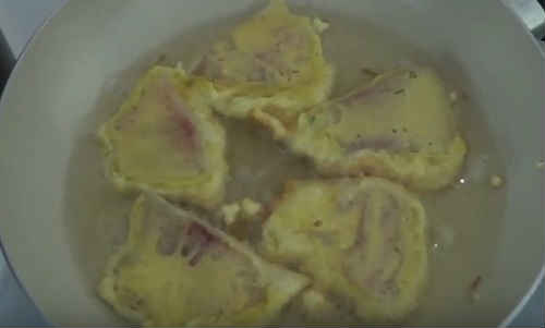 - Час смаження – 3 хвилинки з нижньої сторони. Потім переверніть заготовку, продовжуйте смажити ще 1-2 хвилини. Вогонь трохи зменшіть, щоб не підгоріла скоринка раніше, ніж буде готова рибка.