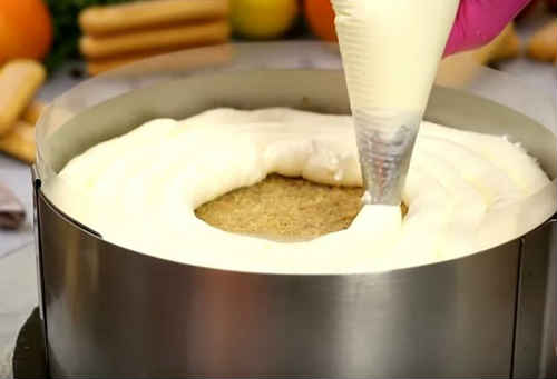 - Візьміть форму, призначену для складання торта. Діаметр десерту на ваш розсуд, можна навіть зробити торт в порційних склянках. Викладіть нижній шар просякнутих Савоярді.