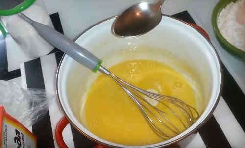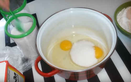 В окремій глибокій мисці змішайте яйця з сіллю і цукром. Гарненько збийте міксером.
