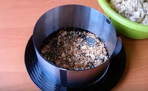 Для складання десерту встановіть на широке блюдо роз’ємне кільце. Низ посипте зібраними при нарезе крихтами.