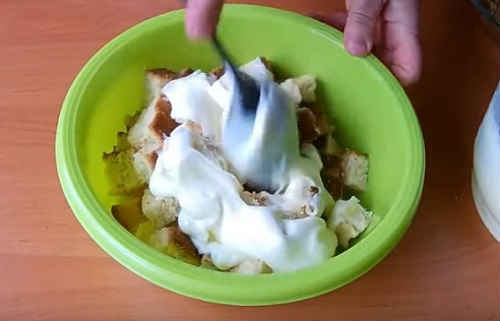- Щоб зробити крем, розбийте яйця в миску, додайте цукор, крохмаль, викладіть сметану.
