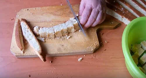 Потім покришіть їх шматочками, схожими на печива, приблизно 2 на 2 сантиметри. Зберіть обсыпавшиеся крихти в мисочку, вони нам стануть в нагоді.