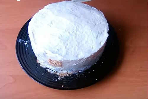 Через заданий час дістаньте десерт, акуратно зніміть кільце. Промажте боки кремом. Верх посипати крихтами від коржика.