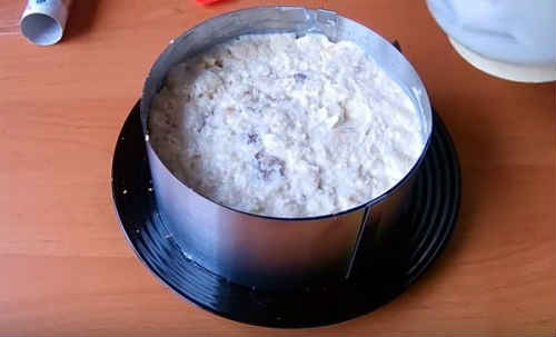 - Змішайте крем з нарізкою коржа і приступайте до складання торта. Щоб зібрати торт, використовуйте широку плоску тарілку і роз’ємне кільце.