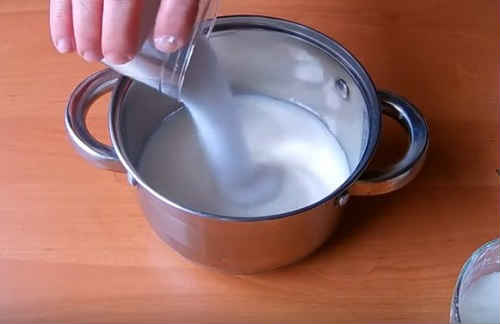 Залишилося молоко влийте в каструлю, засипте цукор. Поставте варитися на середній вогонь.