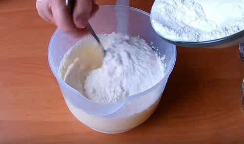 Погасіть соду, відправте в суміш. Почніть підсипати борошно, одночасно замішуючи тісто. Не сипте відразу багато, інакше не впораєтеся з грудками. Тісто вийде не дуже рідким, м’яким, податливим.