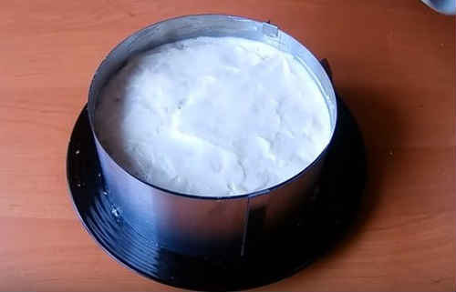 Пролийте верх торта залишками крему (не забудьте про бока, на них теж потрібно залишити). Накрийте форму харчовою плівкою. Відправте на полицю холодильника для застигання. В ідеалі, краще потримати ніч, але якщо час не дозволяє, то 2-3 години.