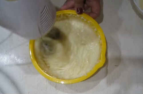 В манну основу Пташиного торта підсипте ванілін. Почніть працювати міксером, потроху підливаючи лимонну частина суфле.