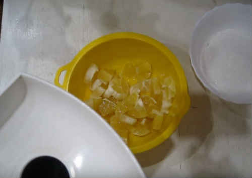 Зріжте з лимона цедру, видалите білу шкірку. Поріжте цитрус на шматочки, не забувши вибрати кісточки.