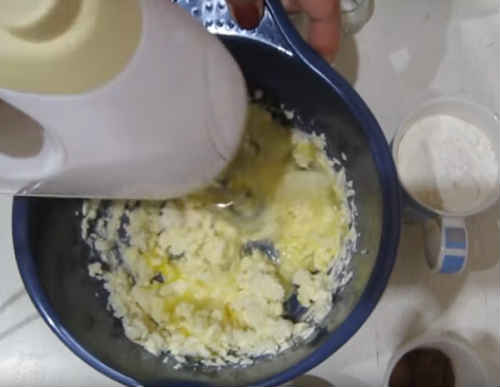 Засипте погашену соду, потім борошно. Старанно попрацюйте міксером.