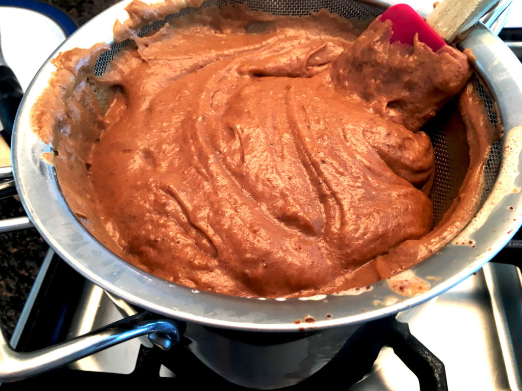 - У ємність, де какао перемішано з молоком, поступово вливати вміст остудженої каструльки.