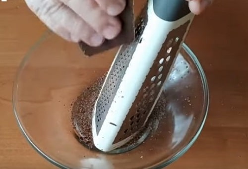 - Залиште десерт для просочення в прохолодному місці. Після переверніть його на широку тарілку і прикрасити шоколадною стружкою.