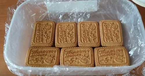 - Підготуйте форму, бажано роз’ємну. Умочуючи кожне печиво в молоко, викладіть прямокутну конструкцію в один ряд.