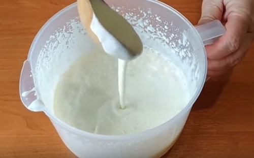 Дивіться, ось такий, досить рідкий крем повинен вийти. Буде густим – розбавте молоком і знову розмішайте. Але враховуйте, що трохи постоявши, консистенція стане густіше.