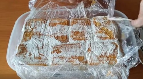 - В вистеленний харчовою плівкою формі, сформуйте торт, викладаючи печиво цілком і промазуючи його кремом. Зверху обов’язковий шар сметанного крему.