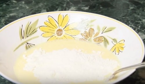 Засипте борошно і додайте приправи, перемішати, щоб вийшло досить густе тісто, як для оладок. Якщо знадобиться, влийте трохи води. Гарненько перемішайте тісто. За бажанням, в кляр допустимо додати тертий на дрібну крихту твердий сир, буде ще смачніше.