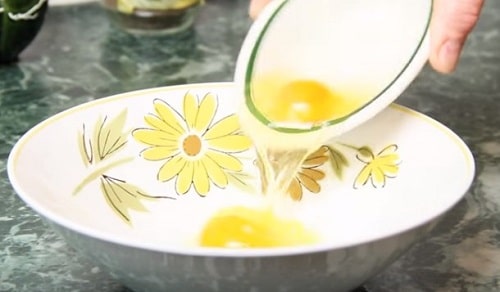 У невеликій мисці розколотіть яйця (щоб вони легше взбивались, додайте крапельку води).
