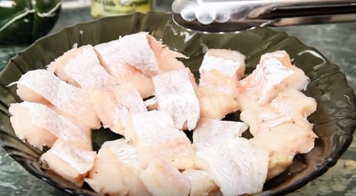 - Поділіть філе тріски невеликими шматочками, покладіть в миску, приправити спеціями, перемішайте. Розмішайте щоб розподілити приправи за рибним шматочках. Накрийте миску, потримайте на столі 30 хвилин, щоб тріска замаринувалась.