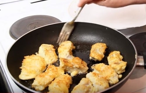 - Обваляйте шматочки борошном зі спеціями, викладіть на сковорідку. Обсмажте з нижньої сторони. Перші пару хвилин готуйте на сильному вогні. Потім зменшіть потужність до помірної, продовжуйте смажити, поки низ шматочків не зарум’яниться.
