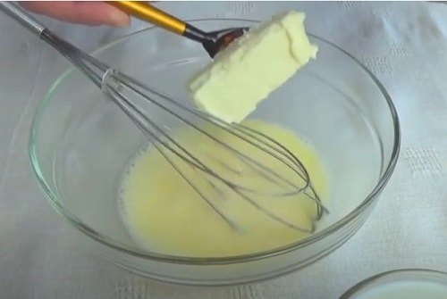 Будь-яким способом розімніть масло, перекладіть до яєць. Знову попрацюйте віночком, зробивши масу однорідною.