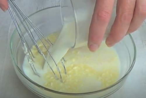 Влийте молоко. Інтенсивно розмішуйте, поки не утвориться однорідна суміш.