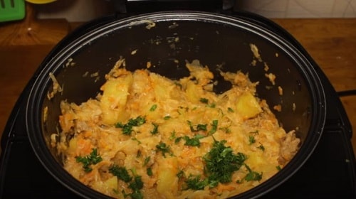 Мультиварка буквально створена для приготування надзвичайно смачних страв. Приклад тому – капуста, тушкована з картоплею. Принадність у тому, що всі продукти готуються разом, без доступу повітря. Завдяки цьому вони просочуються соками один одного, стають ніжними, і неймовірно смачними. Принцип приготування однаковий для всіх видів мультиварок: Панасонік, Редмонд, Вітесс, Поларіс. Різниться може лише назва режимів.