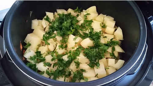 Переведіть режим з смаження на «Гасіння». Викладіть картопляну нарізку. Залийте воду, вона не буде покривати компоненти. Любите, щоб в жаркому картопля плавала, влийте ще трохи, щоб залити повністю. Тут вирішите самі, як вам діяти.