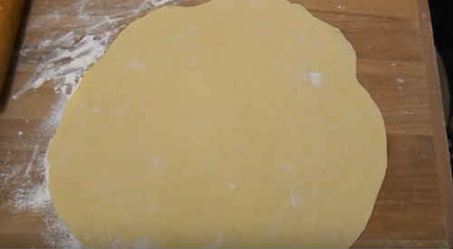 Припудріть робочу поверхню борошном, розкачайте тестовий ком в тонкий коржик. Товщину визначте самі, тільки не робіть занадто тонкою, щоб стінки вареників не рвалися при ліпленні й варіння (1,5-2 міліметри достатньо).