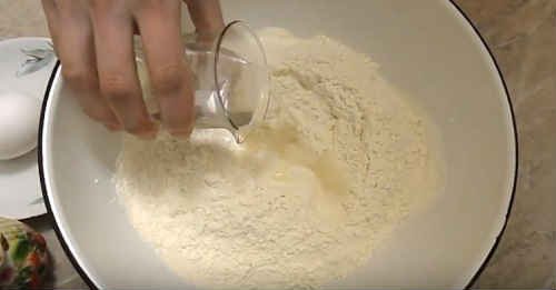 - У кілька прийомів засипте борошно. Розмішуйте ложкою, але коли робити це стане важко, перейдіть на стіл, не забувши присипати його борошном.