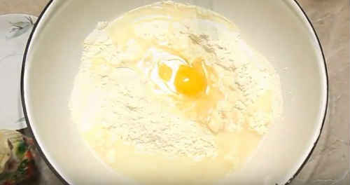 - Коли тестова маса охолоне, додайте яйце, замісити тісто. Якщо маса буде рідкою, по ходу дій підсипте борошно. Вимішуйте тісто не менше чверті години.