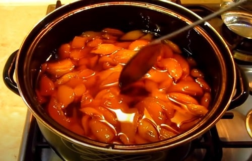 - На ранок часточки дадуть сік. засипте в каструлю цукор, що залишився. Поставте варитися.