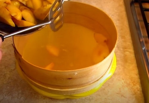 - Невеликими порціями бланшуйте нарізку. Для цього закип'ятіть воду, насипте лимонну кислоту. Варіть часточки в окропі приблизно 2 хвилини. Вони повинні залишитися твердими. Відкиньте їх на друшляк, дайте воді повністю стекти.