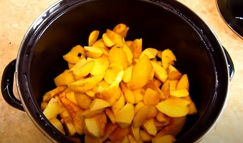- Перекладіть айву в каструлю, насипте 3 великі ложки цукру і киньте щіпку лимонної кислоти. Розмішайте, накрийте, залиште до наступного дня.