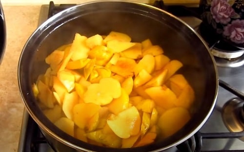 Зважте нарізку. Складіть в каструлю, влийте необхідну кількість води. Поставте варитися. На повному вогні доведіть до закипання. Після понизьте потужність вогню. Варіть, поки дольки айви не стануть м'якими. У вас піде приблизно 10-15 хвилин. Наколи шматочки виделкою, і ви зрозумієте, пора вимикати, або ще проварити.