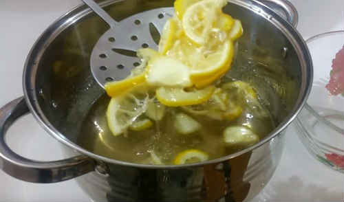 Виловите шумівкою з каструлі лимон, перекладіть в миску, вони ще знадобляться.