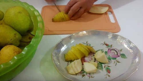 Поки лимон вариться, груші наріжте. Ріжте шматочками, не дуже великими, як на фото. Коли нарежете, зважте і відміряйте необхідну кількість солодощі.